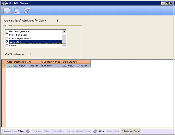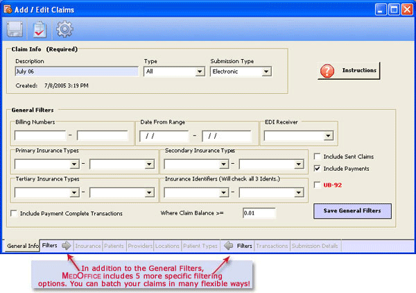 This is the main screen for adding a new batch of claims for processing. You can choose to file on paper or electronically. No other software allows you to filter claims for processing like MedOffice – you can select to batch claims by billing #, dates, type of insurance, and numerous other filters shown on the bottom tabs.