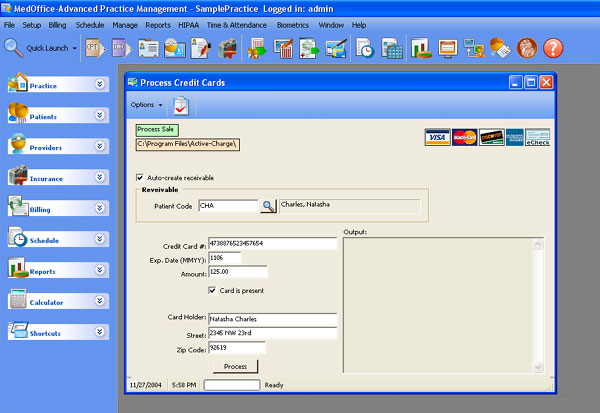 Of course, you must set up MedOffice in advance with your merchant account information. If you are not an authorized merchant account, contact ClaimTek; we can help you get set up as a credit card merchant.